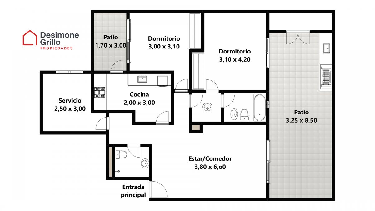 Patio principal (3,25 x 8,50) con excelente parrilla, un verdadero pulmón verde para disfrutar de encuentros y asados al aire libre.